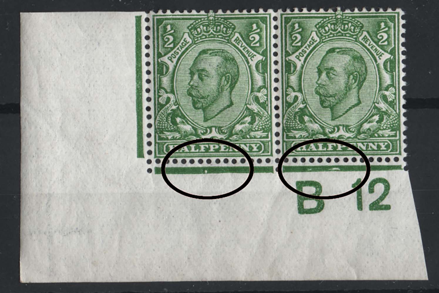 GB 1911 ½d die 2 yellow-green wmk crown sg340 B12(c) plate 16 corner pair um, perf type 2
