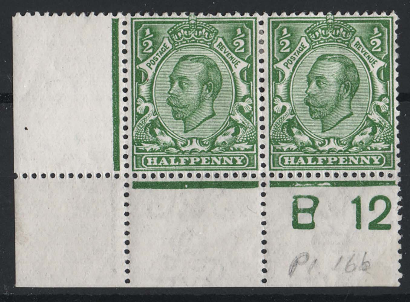 GB 1911 ½d die 2 watermark cypher sg344 mint B12(c) plate 16b corner pair, perf type 2A, heavyish mount, some separation between stamp & left margin, variety damaged B in B12 [ref: 294/406 sa/ak0287]
