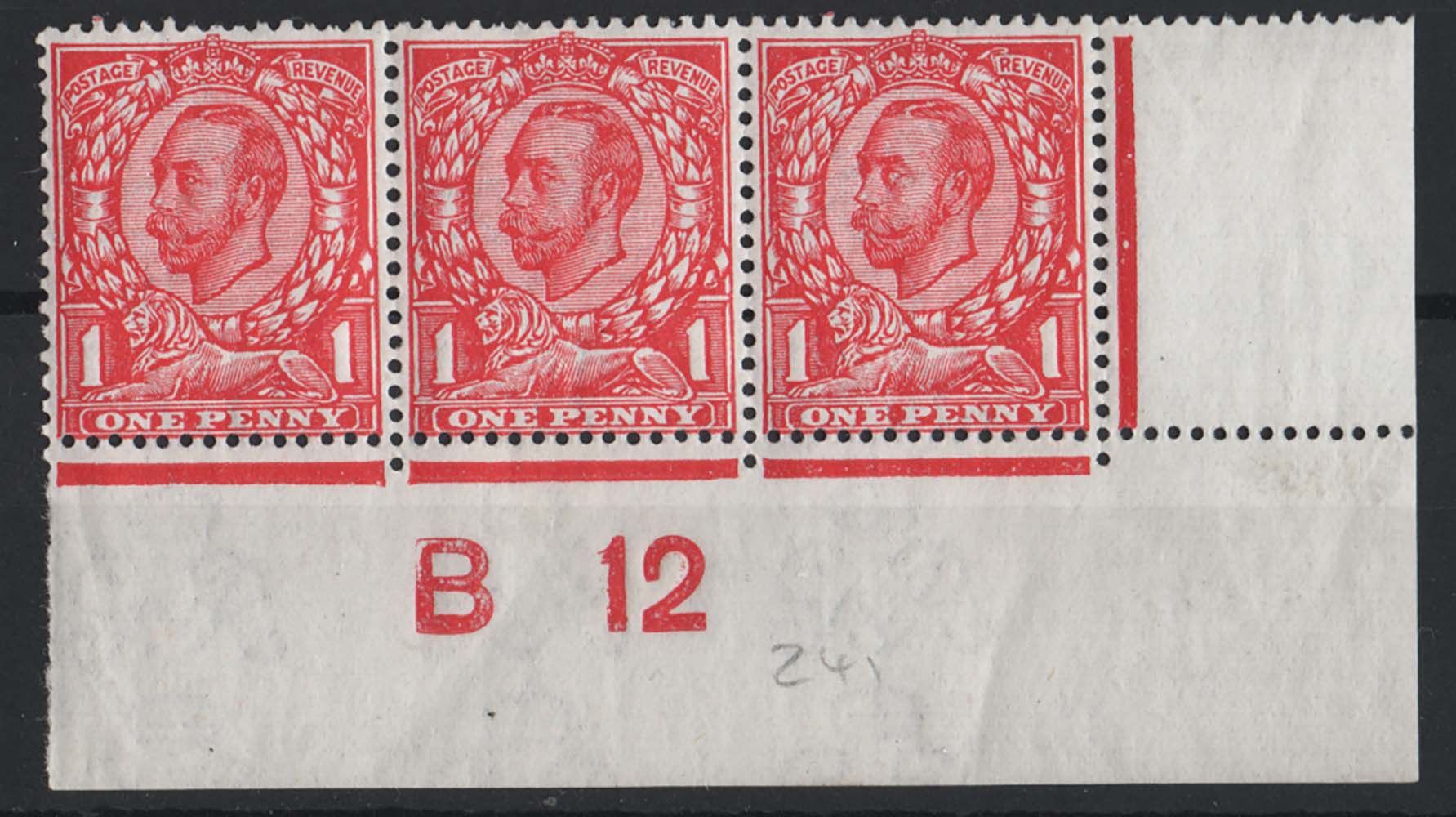 GB 1911 1d die 2 watermark cypher sg345 unmounted mint B12(w) plate 16a corner pair, perf type 2, (actually a strip of 3 with r20/10 mm, reduce to a pair if a mount offends) [ref: 294/407 sa/ak0291]