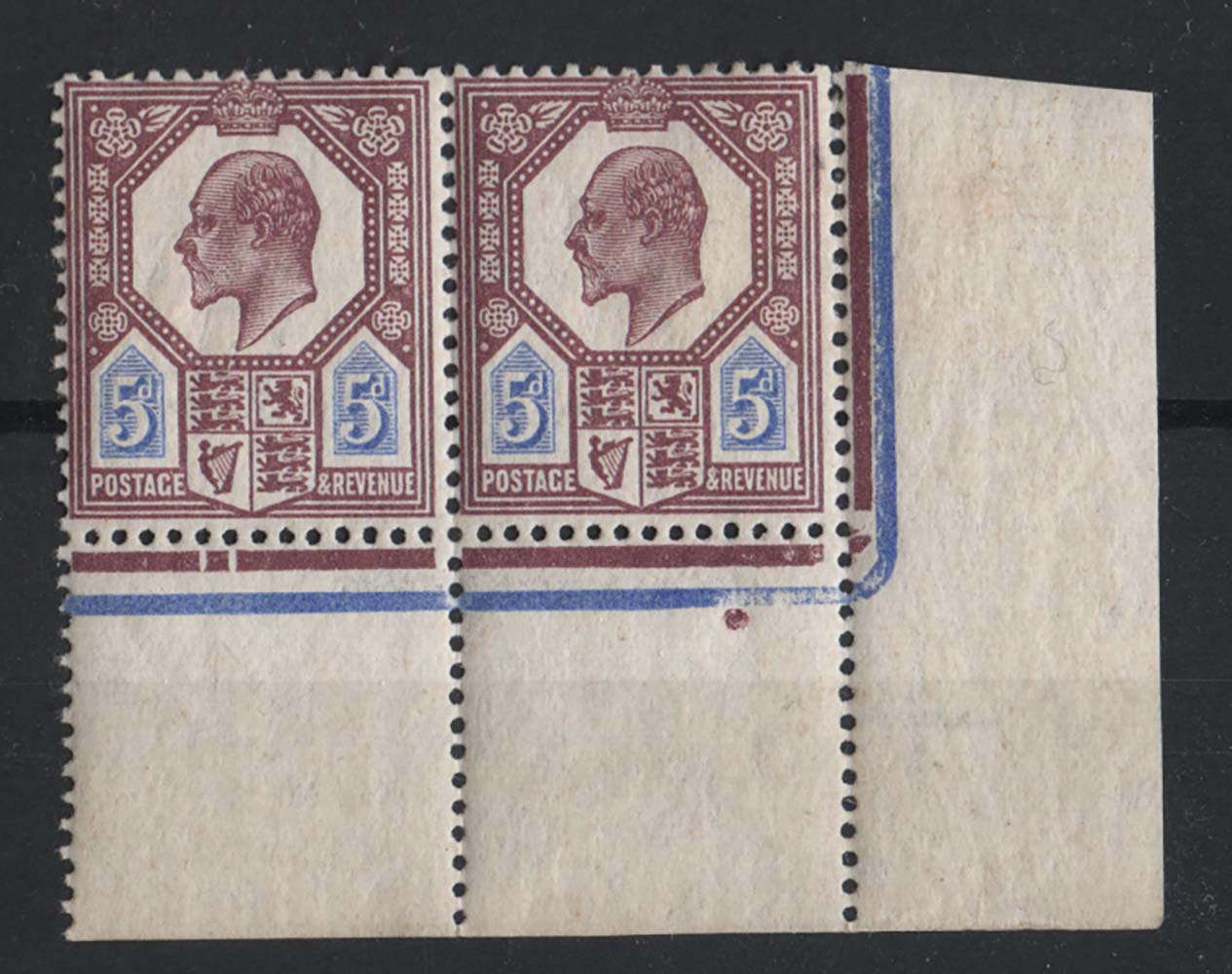 GB 1911 5d dull reddish-purple & blue fine mint date cut corner pair, separation between stamps, priced as 2 singles sg293, lower pair, right pane [ref 293-408/sa/ak0591]