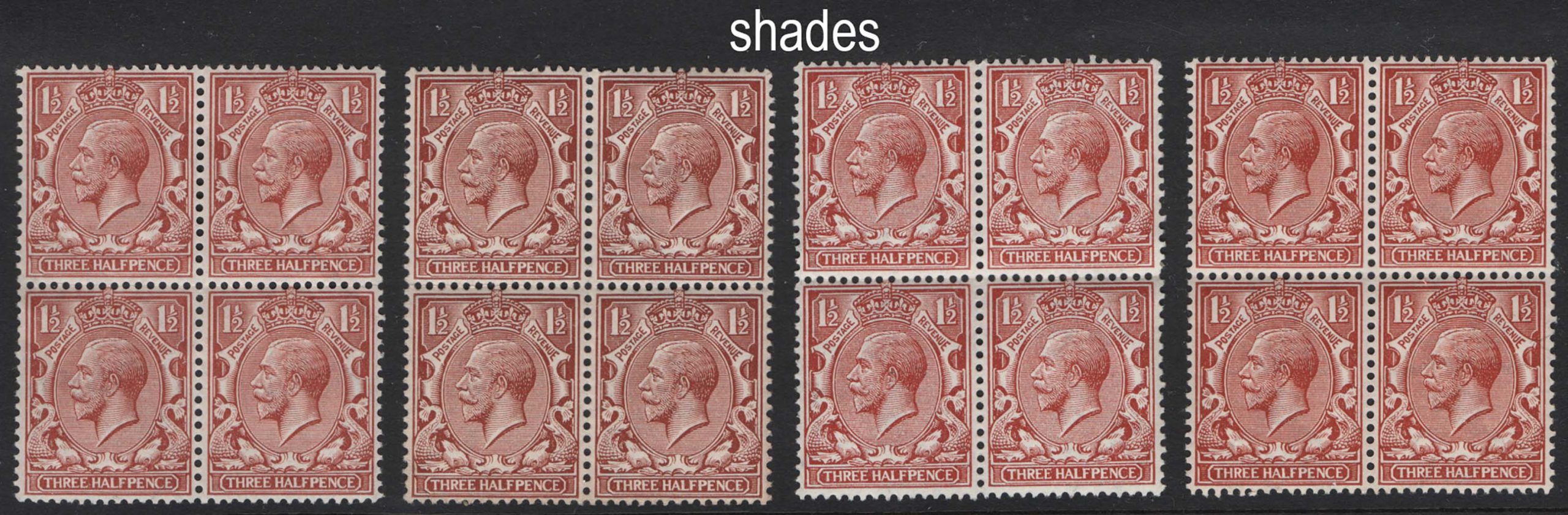 GB 1912 1½d 4x distinct shades in unmounted mint blocks of 4 sg362, etc [ref: 294/414 s/ai0439]
