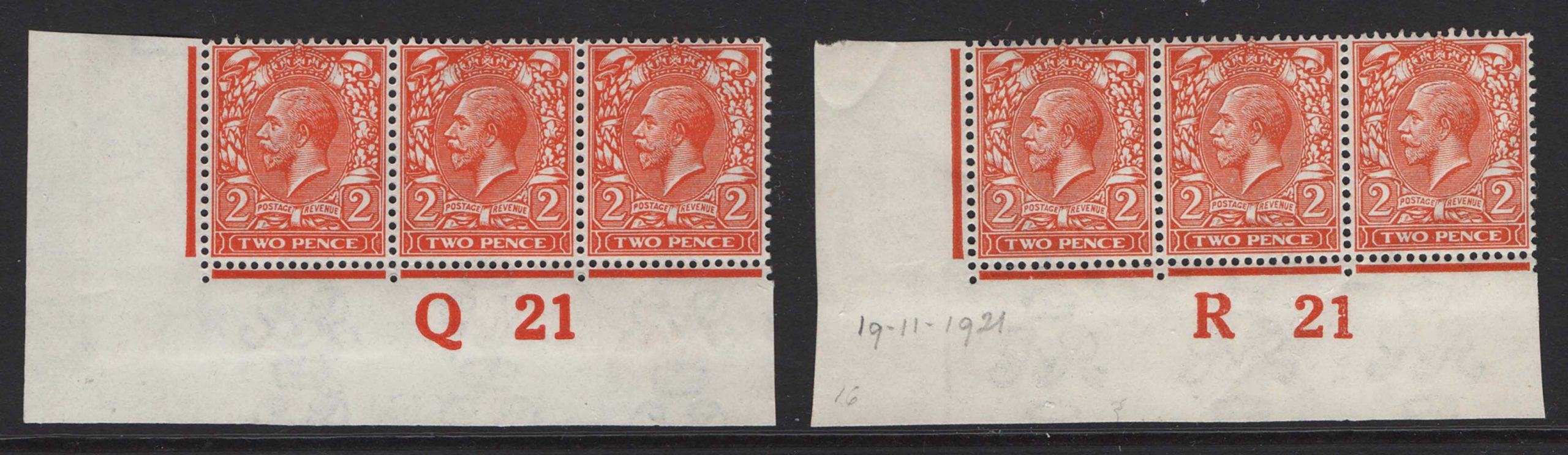 #417 GB 1912 2d bright orange Q21 corner strip of 3 um + R21 orange sg368-9 Spec N19(7) & N19(5) (R21 gum bend) c£48 as singles