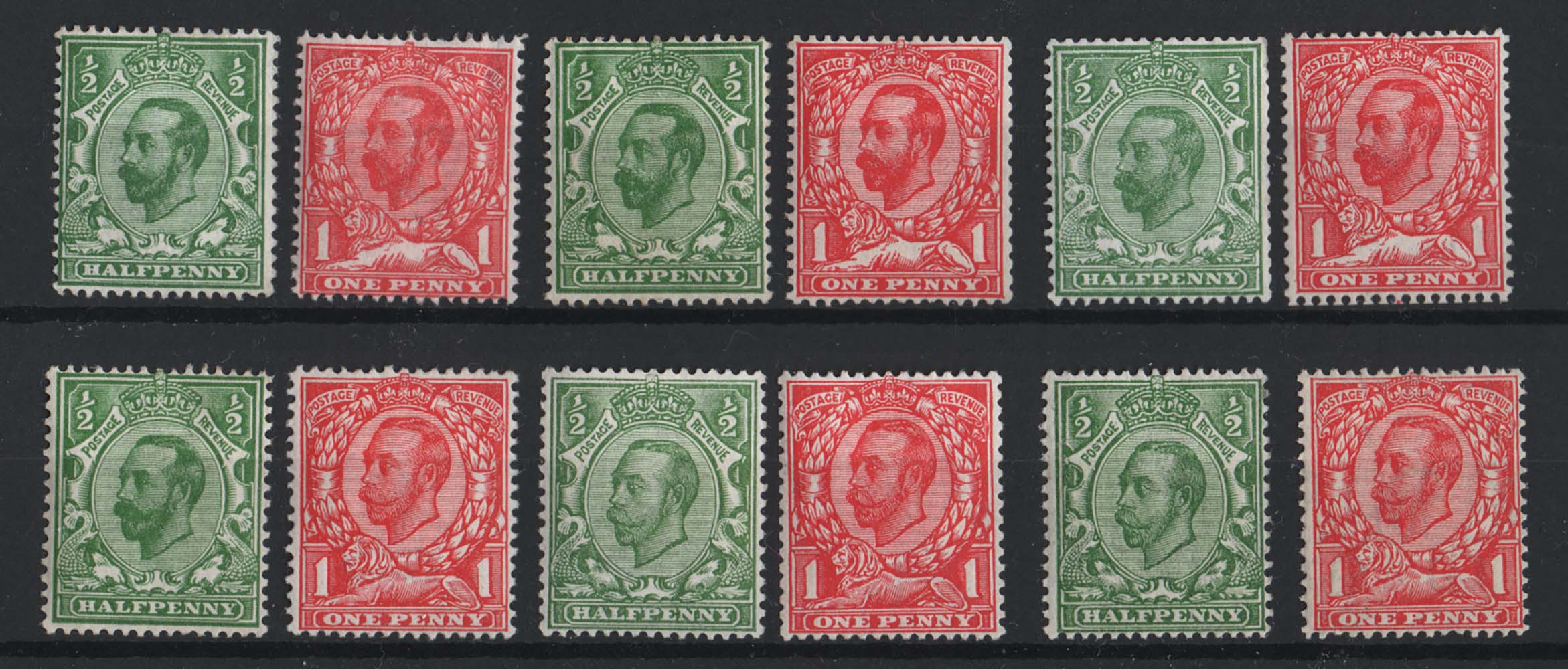 GB 1911 Downey Heads basic set of 12 fresh m/mint ½d & 1d die 1a,1b, 1b watermark cypher, then die 2, crown, cypher, m/cypher, perfs as scan, sg321-350 [ref 293-422/sa/ak0750]