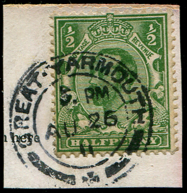 GB 1911 ½d sg323a ERROR PERF 14 & BLUISH-GREEN very fine used on piece, tied by complete Great Yarmouth 1911 double ring cds A scarce combination of perf error & rare shade Spec N1/4b, RPS Cert [ref 293-425/sb/al111]