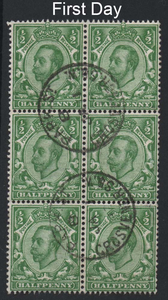 GB 1911 ½d yellow-green die 2 watermark crown very fine used block of 6, FIRST DAY Grosvenor Square cds Jan 1, 1912, a rare block sg340 [ref 293-430/sa/ak0711]
