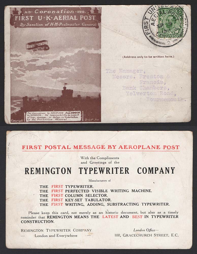 GB 1911 1st Aerial post ½d advertising card London SP9 #2, Remington Typewriter Co advert [ref 291-435/sa/9q0013]