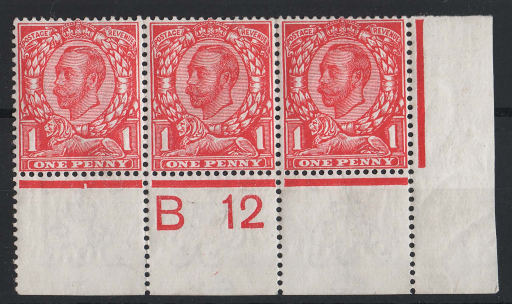 GB 1911 1d die 2 watermark cypher sg345 unmounted mint B12(w) plate 12 corner strip of 3, perf type 2A cat £60 [ref 293-437/sa/ak0292]