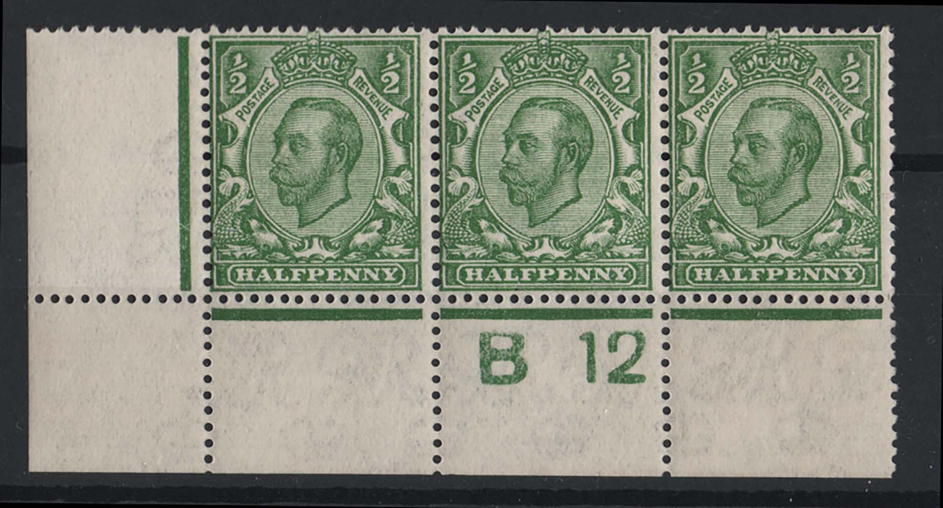 GB 1911 ½d green die 2 watermark multi-cypher sg347 unmounted mint B12(c) corner strip of 3, perf type 2 [ref 293-439/sa/ak0294]