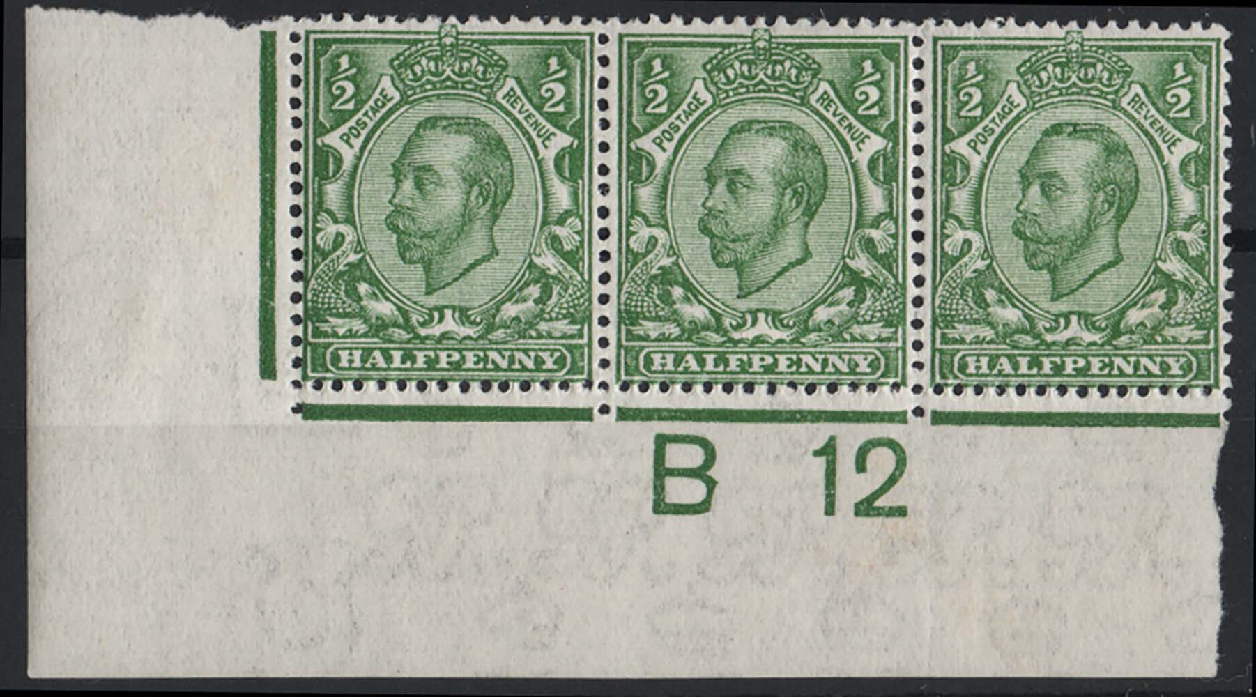 GB 1911 ½d green die 2 watermark multi-cypher sg347 very fine mint B12(w) corner strip of 3, perf type 2A [ref 293-440/sa/ak0295]
