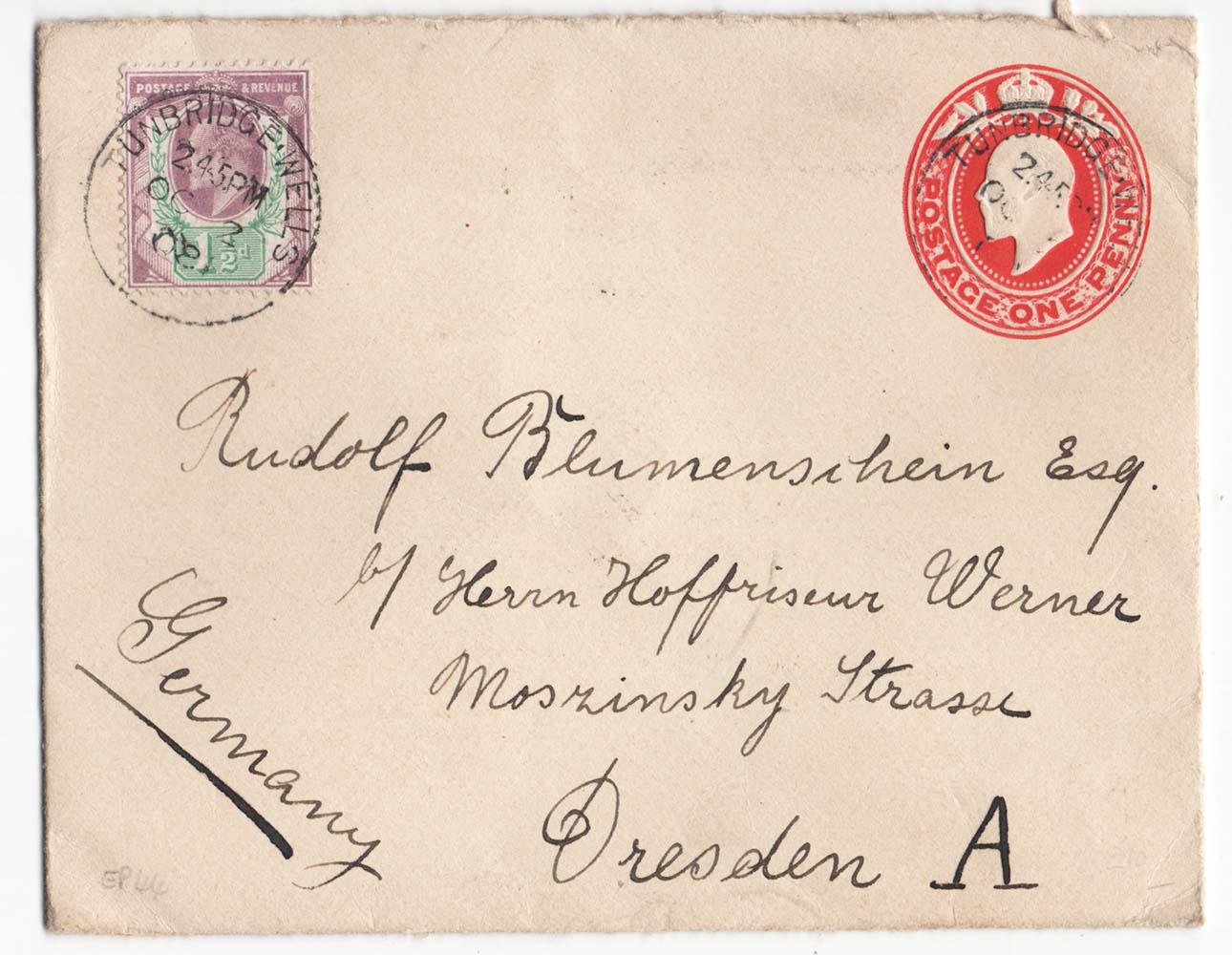 GB 1902 1d stationery envelope uprated 1½d chalky sg223 cds, Tunbridge Wells to Dresden – nice [ref 290-443/sa/ag0250]