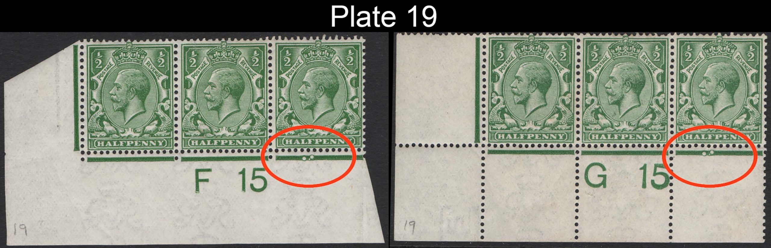 GB 1912 ½d green very fine mint F15 & G15(P) corner strips of 3 from plate 19 shown by the double dots under r20/3, (4x um) sg351 [ref 293-444/sa/ak0347]