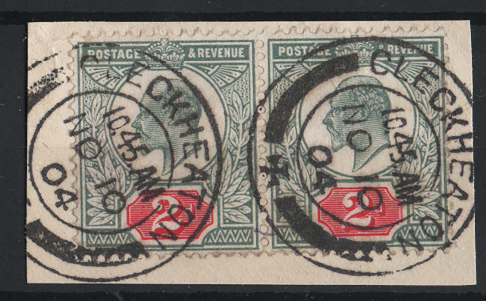GB 1902 2d grey-green & deep carmine-red sg225var Spec M11(4) vfu Cleckheaton cds pair on piece c£70+ [ref 290-448/sa/ag0255]
