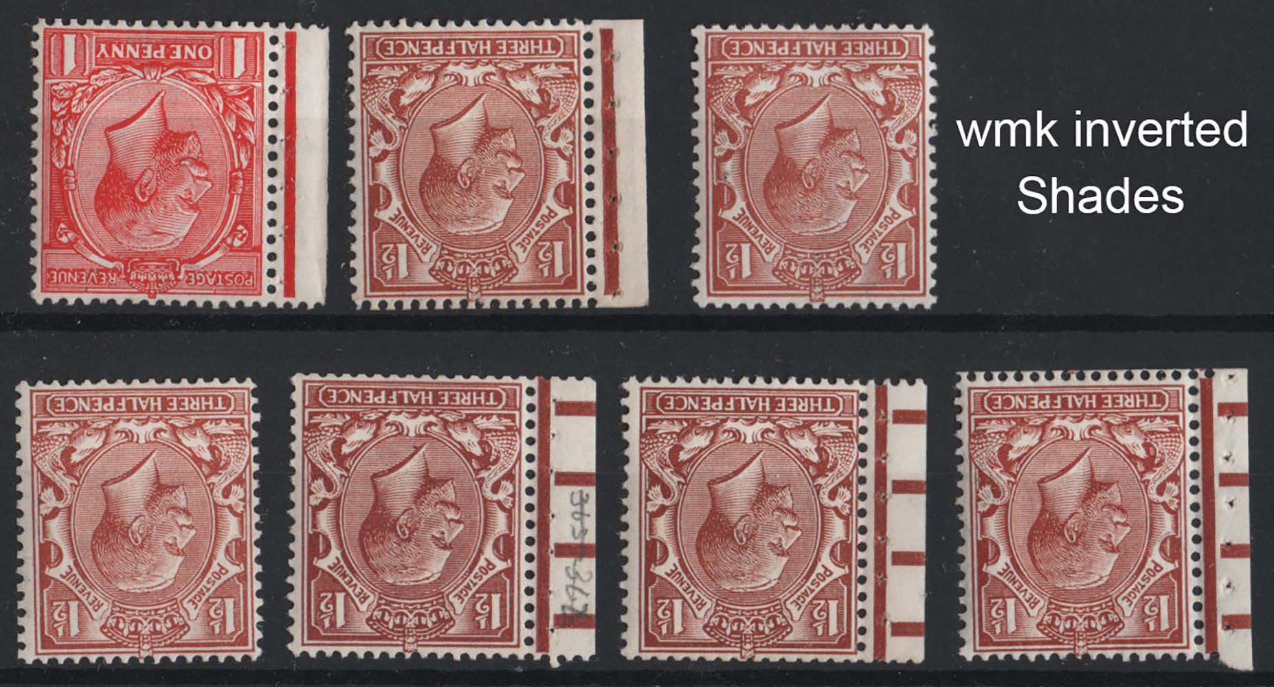 1½d block cypher wmk inverted 5x um with good shades, also 1d & 1½d inverted with part letters of ‘Postage’ in the wmk sg420wi