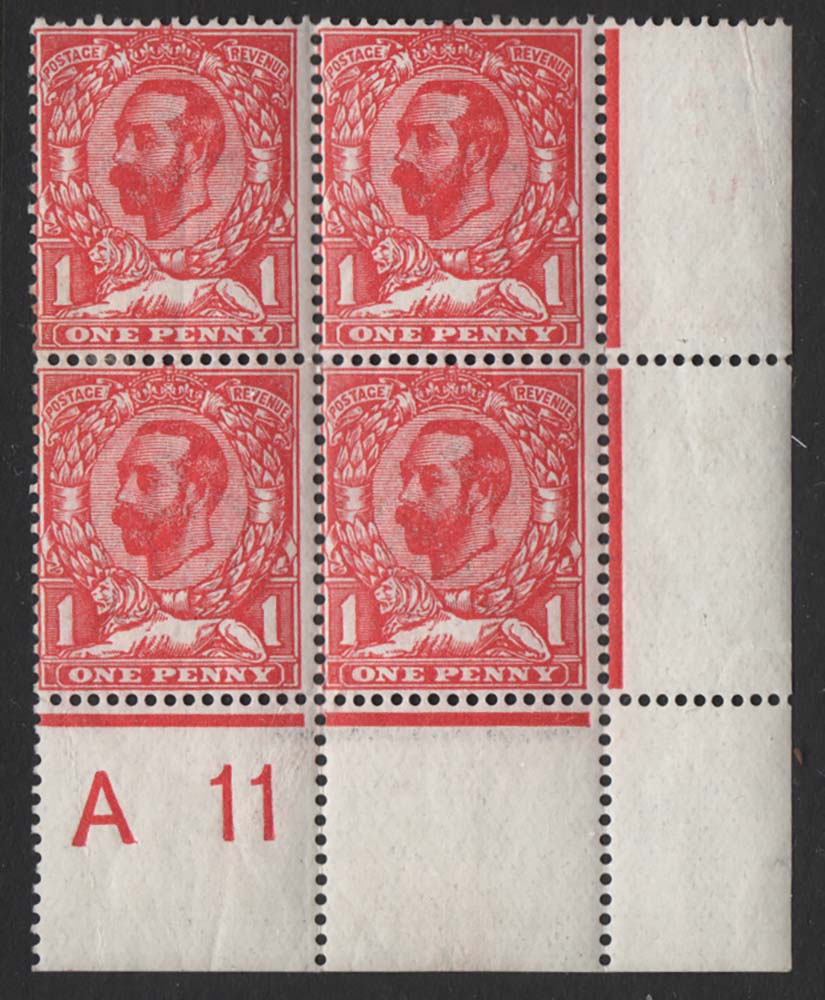 GB 1911 1d die 1a carmine-red A11(w) corner block of 4, m/mint light tone, perf type 1A sg327 cat £60+ Downey Heads [ref 291-458/sa/ai0189]
