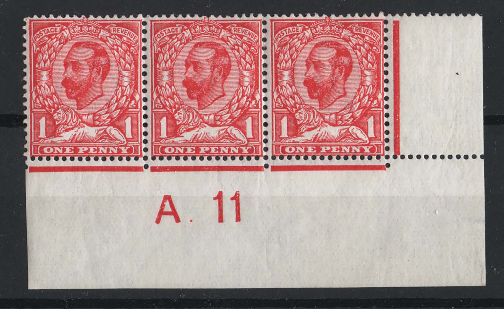 1d die 1b carmine A.11 corner strip of 3 um perf type 2, sg329 some separation between r20/11-12 c£45 as singles, Downey Heads