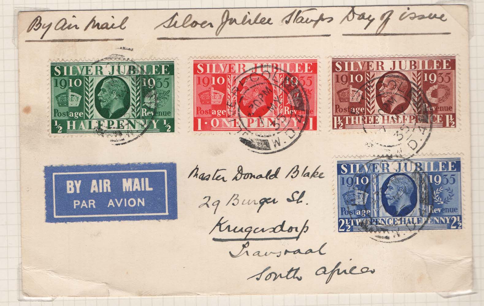 GB 1935 Silver Jubilee, neat FDC airmail to South Africa sg453-456 [ref: 294/460 sa/ak0518]