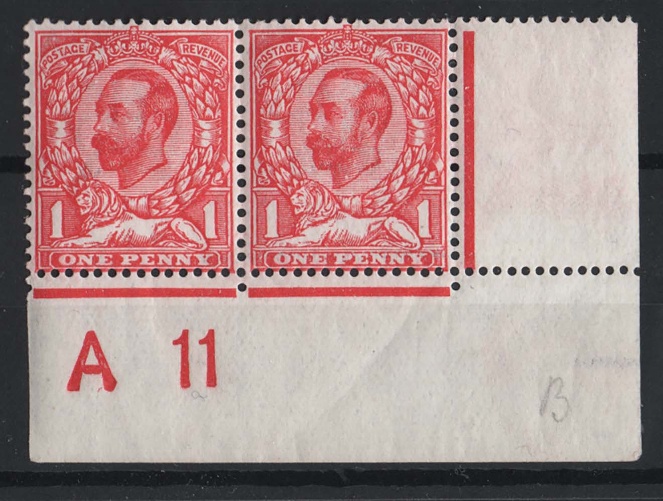 GB 1911 1d die 1b carmine A11(c) corner pair um perf type 2, sg329 c£40 as mm