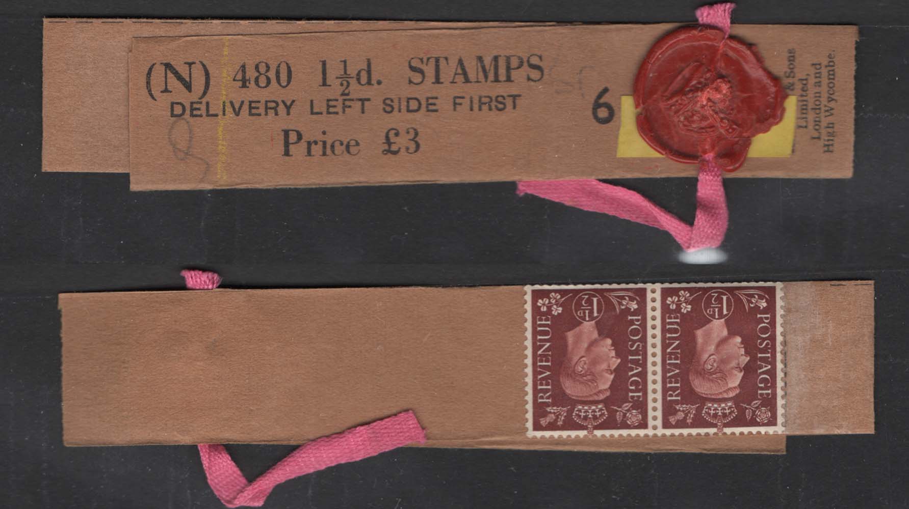 GB 1937 Dark colours 1½d watermark sideways N480 coil leader #6 with 2 stamps attached sg464a unmounted mint leader not contiguous cat £60 [ref: 294/469 s/am0076]