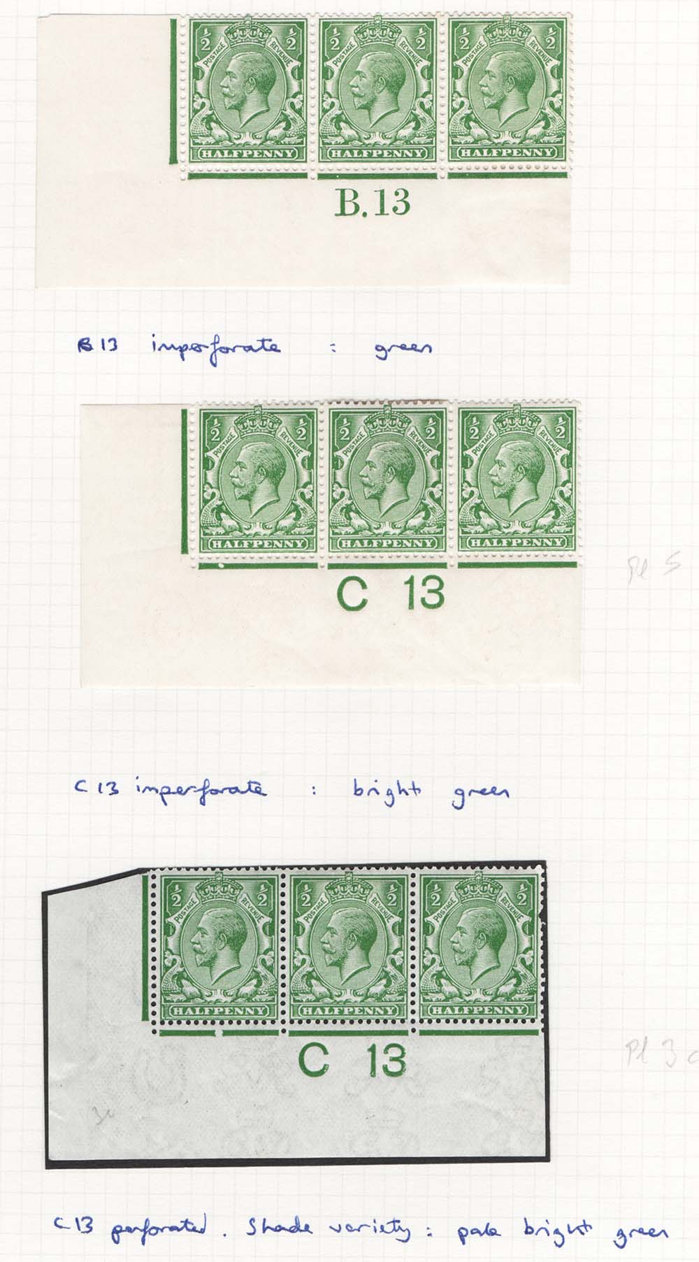 GB 1912 ½d sg351 control B.13 corner strip of 3, ditto C13 plate 5 and C13 plate 3c very fine mint, shades [ref 291-478/l/ai0165]
