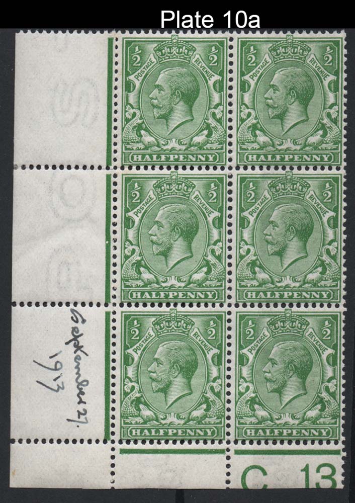 GB 1912 ½d green C13(P) plate 10a corner block of 6, stamps unmounted mint, scarce plating piece, dot R19 10.5mm, no dot under A of r20/1 sg351 [ref 291-479/sa/ai0294]