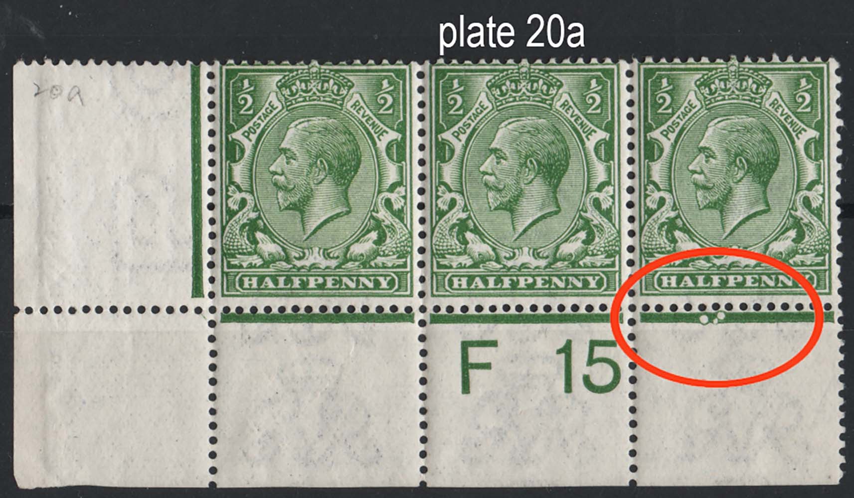GB 1912 ½d green sg351 F15(P) corner strip of 3 from plate 20a (3 dots under LF of r20/3) very fine mint, (appears um) [ref 291-480/sa/ai0435]