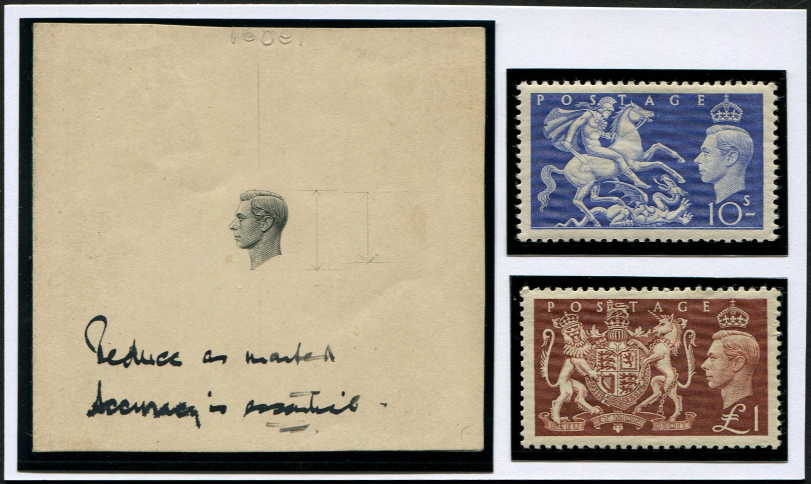 GB 1951 Festival high values sg511/512 HEAD PLATE PROOF on Buff card (with pencil guide line marks & manuscript “reduce as marked/accuracy essential”) this head was used for the 10s & £1. Very rare. [ref: 294/482 sb/an105]
