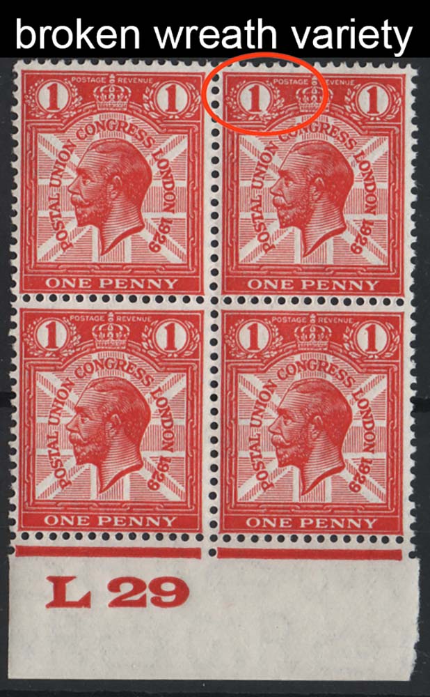 GB 1929 PUC 1d r19/12 broken wreath variety Spec NCom6d very fine mint L29 block of 4 sg435 cat £200 [ref 293-485/sa/ak0611]