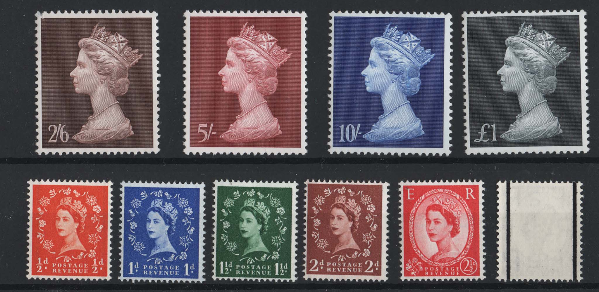 GB 1957 Graphite set of 6 unmounted mint, also 1969 Machin 2/6d – £1 unmounted mint sg561-566, 787-790 [ref: 294/494 sa/am0414]
