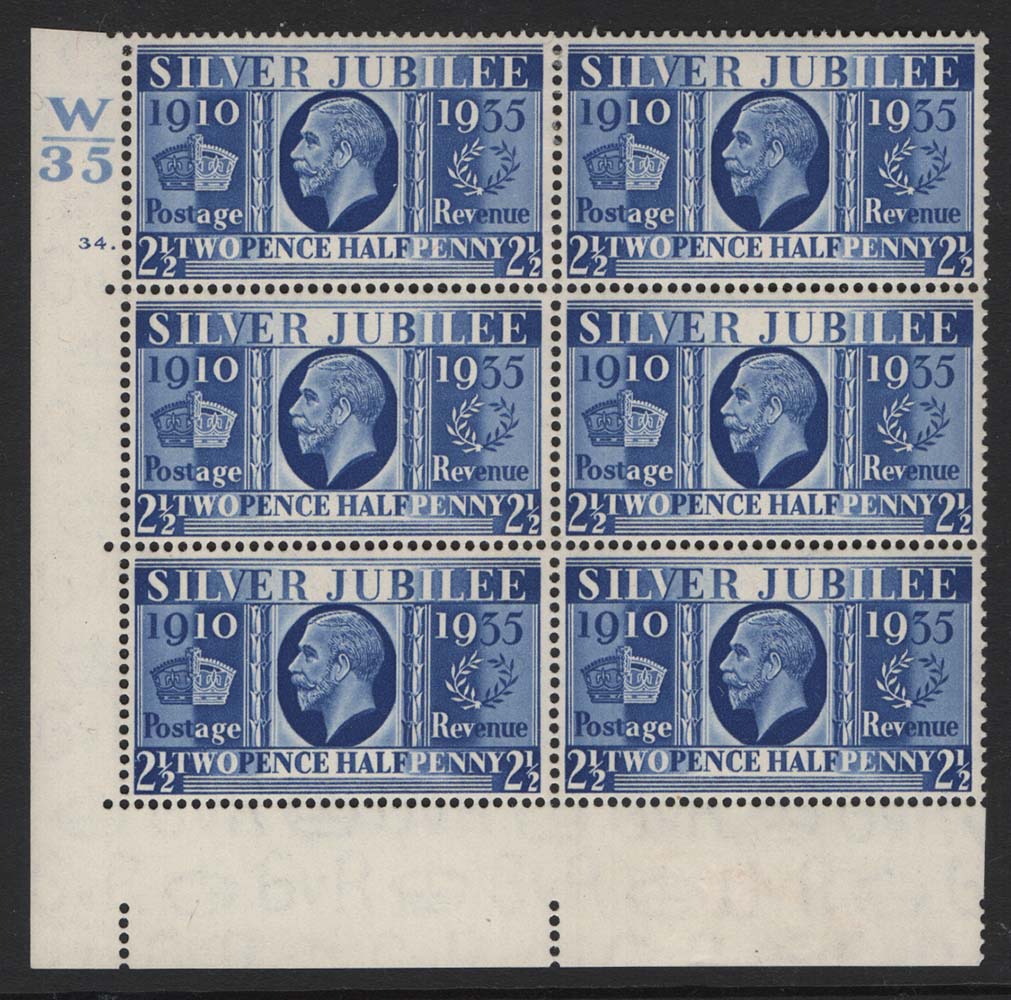 GB 1935 Silver Jubilee 2½d cyl 34 dot corner block of 6 fine mint sg456 cat £80 [ref 293-505/sa/ak0496]
