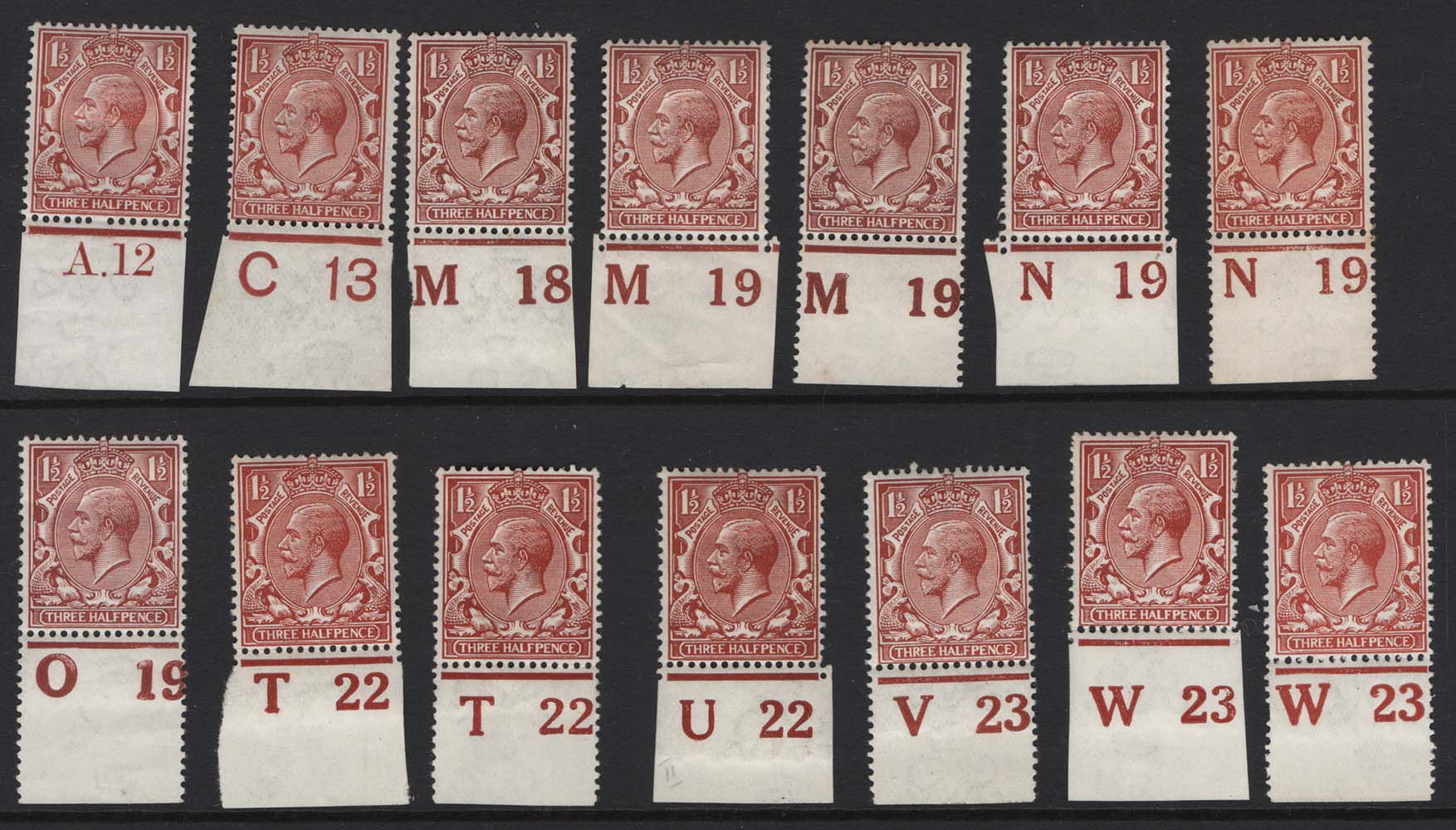 GB 1912 1½d 14x different fine mint control singles, see scan, wide range of shades, sg362, etc [ref 291-508/s/ai0021]