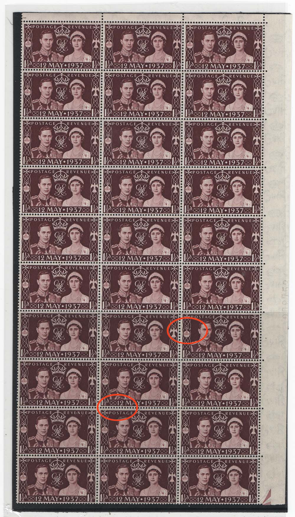 GB 1937 Coronation r7/6 spot in lacing and r8/5 spot under 2 of 12 varieties, unmounted mint block of 30 sg461 NCom1h [ref 293-510/b08/ak0516]