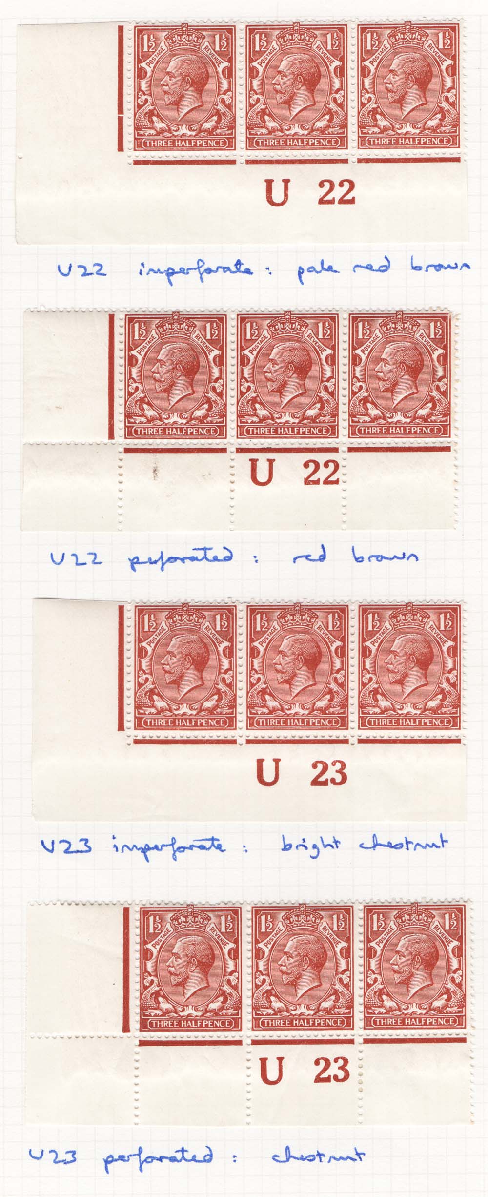 GB 1912 1½d sg362, etc controls: U22, U22(P), U23, U23(P) strips of 3 very fine mint, 1x unmounted mint in each, collector’s shade descriptions may not all be correct [ref 291-512/l/ai0163]
