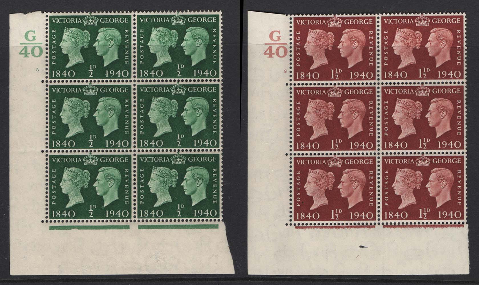 GB 1940 Centenary ½d unmounted mint cyl 3 no dot block of 6, ditto 1½d cyl 3 no dot sg479, 481 cat £27 [ref 293-524/sa/ak0343]