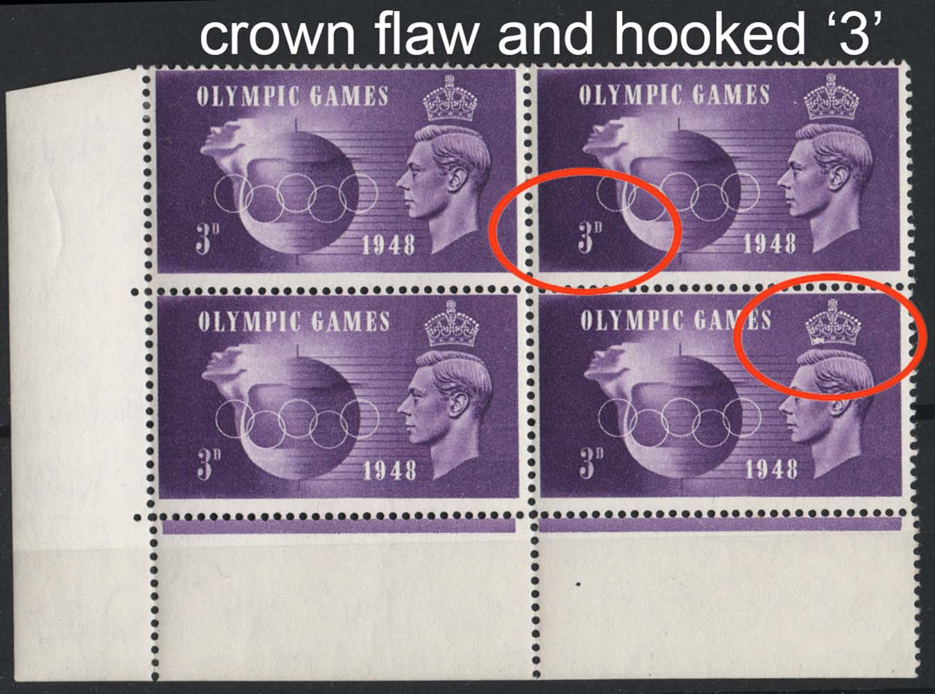 GB 1948 Olympics 3d r20/2 crown flaw & r19/2 ‘hooked 3’ fine mint corner block of 4 sg496a cat £75 [ref 293-538/sa/ak0710]