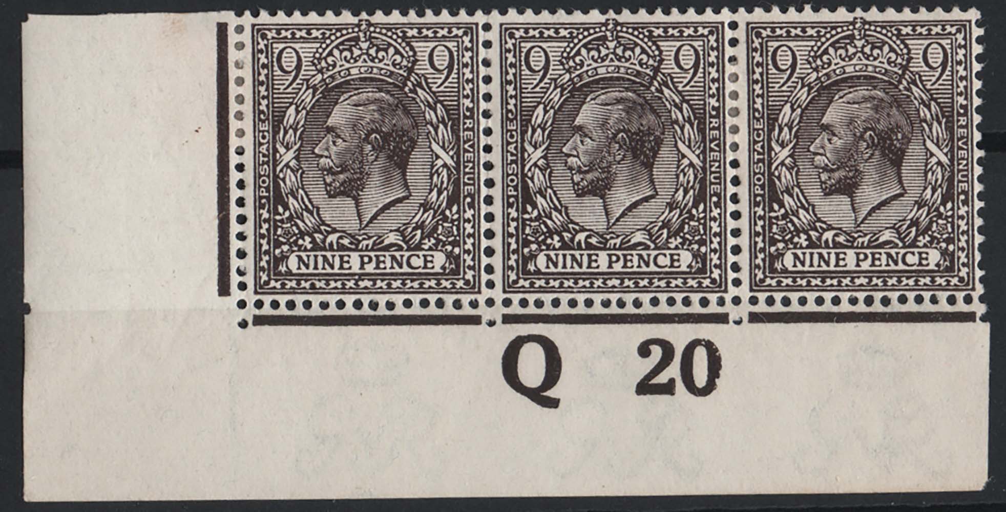GB 1912 9d agate sg392 Q20 corner strip of 3, variety ragged right edge to ‘0’ of Q20, fresh m/mint, separation between r20/1-12 [ref 291-543/sa/ai0297]