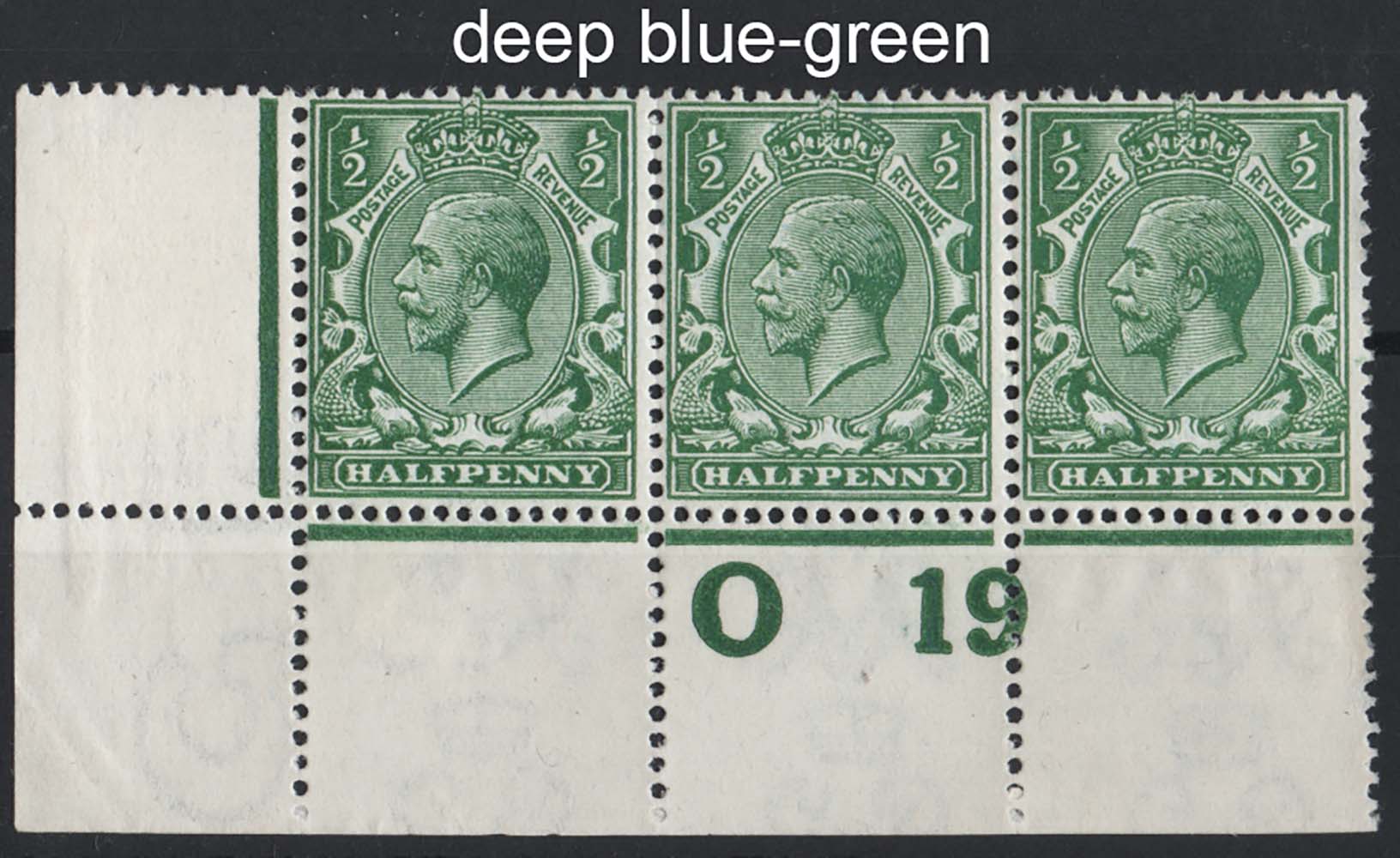 GB 1912 ½d deep blue-green control O19(P) corner strip of 3 vf mint (2x um), r20/1 especially deep sg356var [ref 290-552/sa/ag0377]