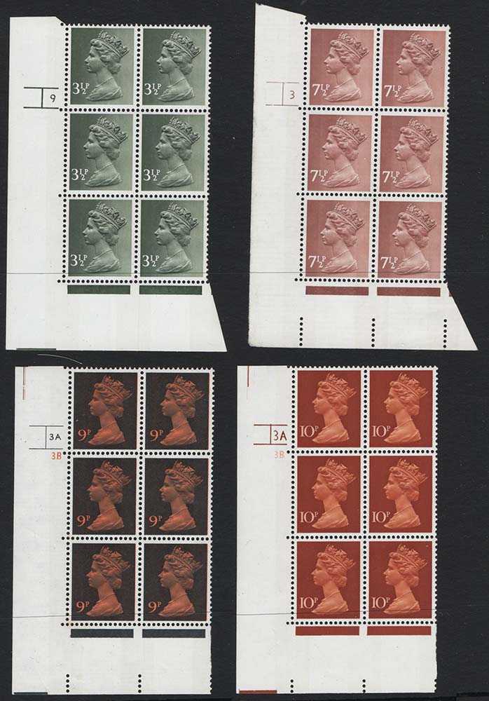 GB 1971 Machin unmounted mint FCP/PVA cyl blocks: 3½p 2B 9 p7, 7½p p1, 9p 3A3B p1, 10p 3A3B p1, all no dot, MCC £40 [ref 293-586/b92/ak0109]