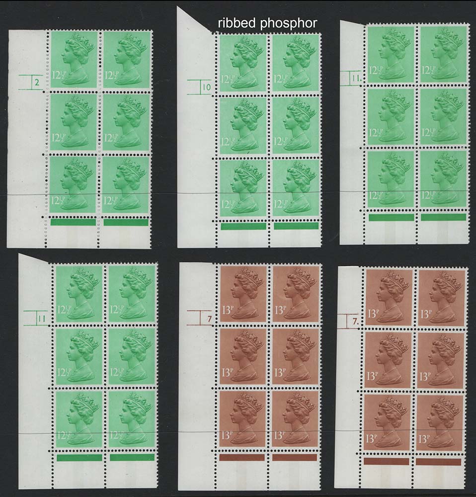 Machin um FCP/PVA cyl blks: 4x 12½p CB, 2x 13p CB cyl 10 with strange vertical ‘ribbing’ in the phosphor – unusual