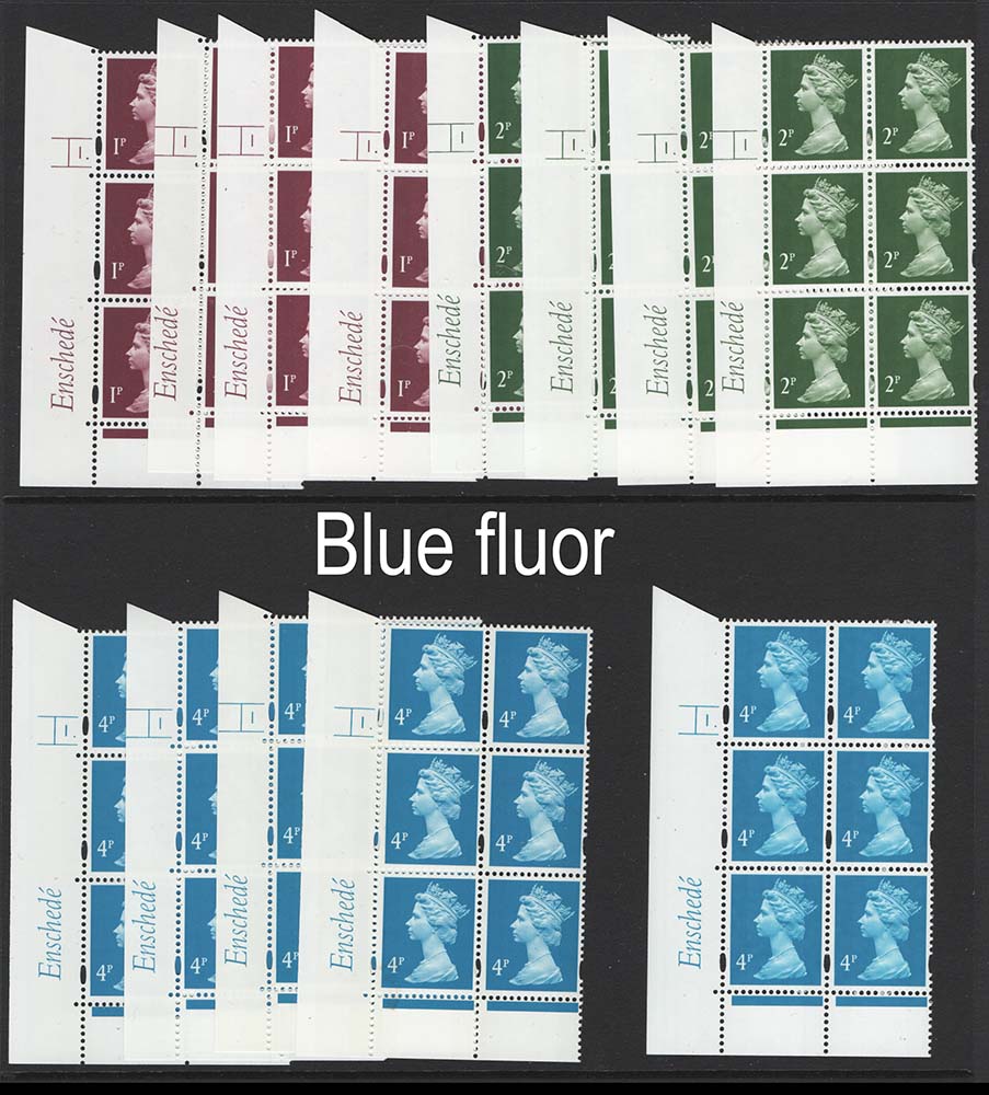 Enschedé blue fluor: 1p cyl 1 & 1 dot both blue & white gum, ditto 2p and 4p in same group of 4 – all v fine, also 4p 1 dot cream gum MCC£43 – all v fine