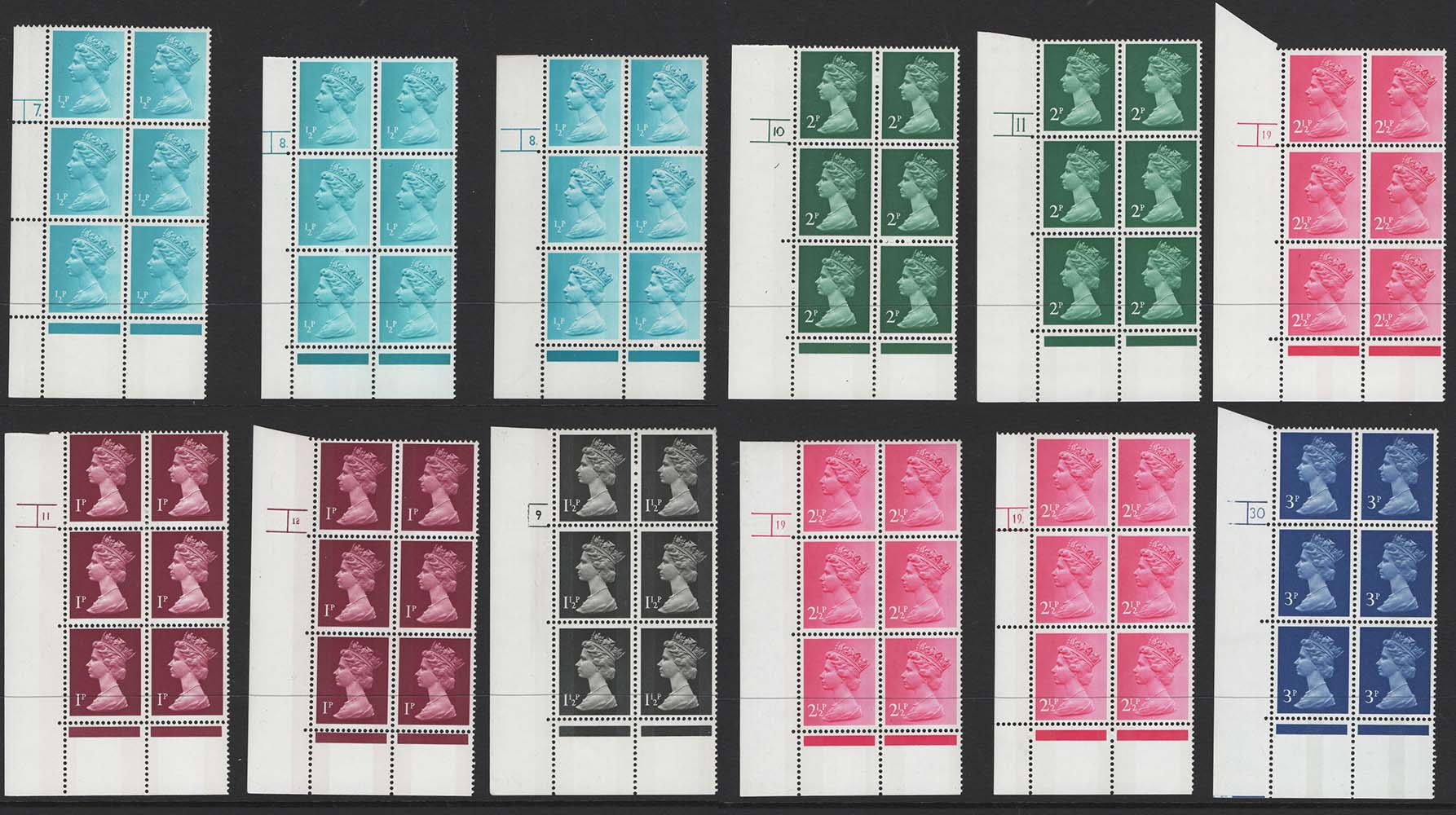 GB 1971 Machin unmounted mint PCP/PVAD cyl block range: ½p – 3p range incl 3 with EEH, extra extension perf hole, see scan [ref 293-595/b92/ak0110]