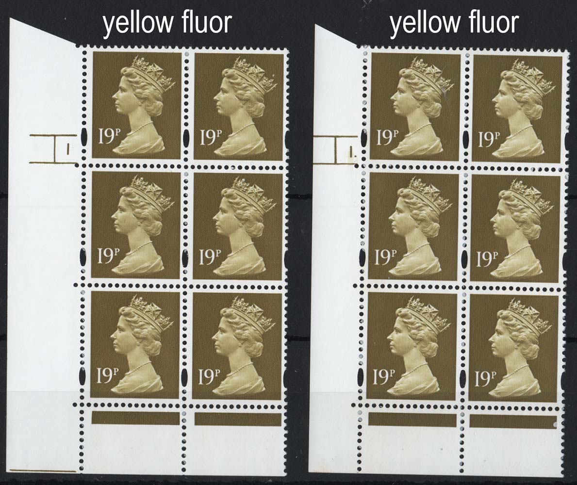 GB Machin Cyl blocks Harrison elliptical 19p CB yellow fluor cyl 1 and 1 dot MCcat £25 [ref: 294/595 sa/am0155]