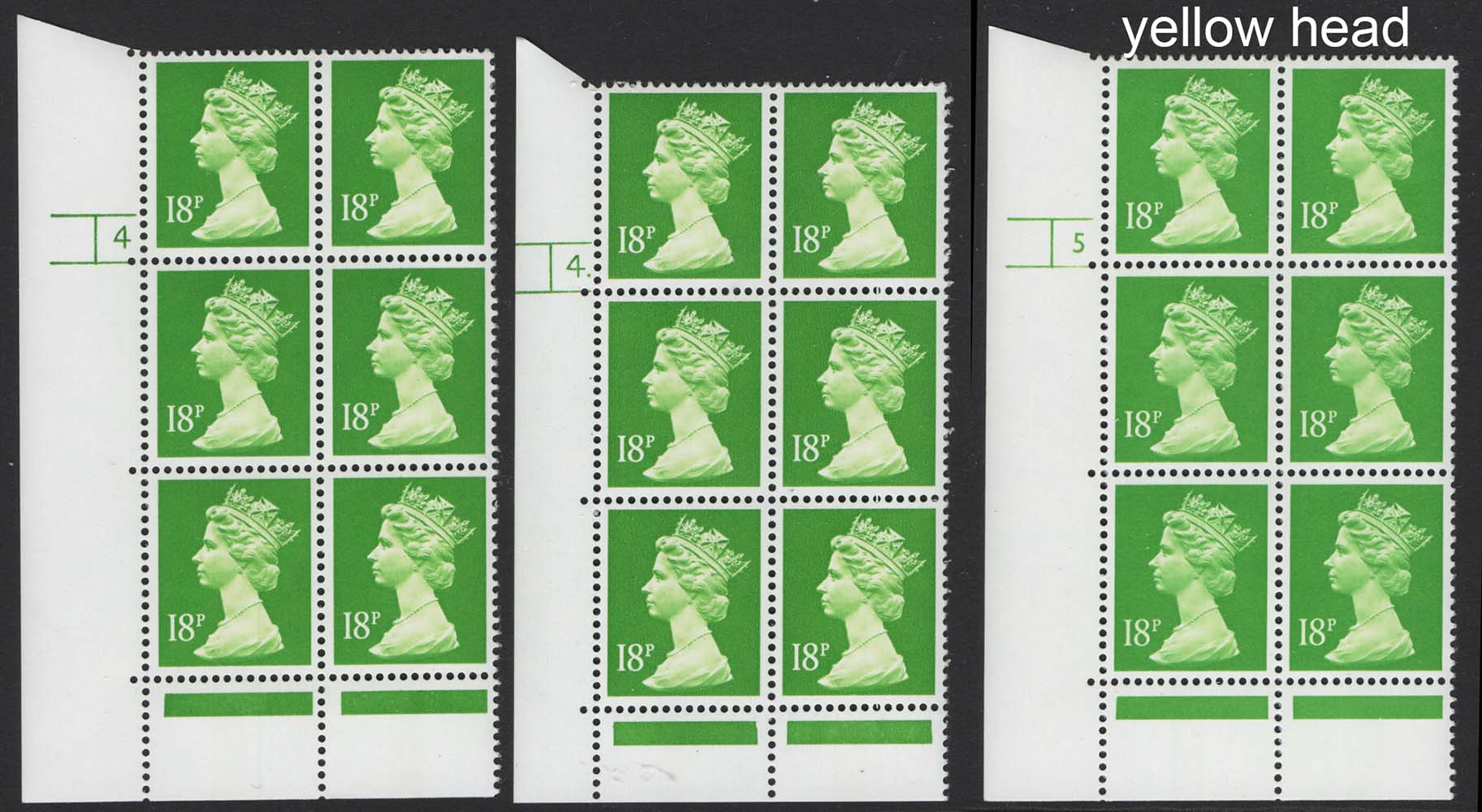 GB Machin Cyl blocks Machin 18p CB FCP/PVA cyl 4, 4 dot, also cyl 5 no dot with yellow head MCcat £18 [ref: 294/598 sa/ak0763]