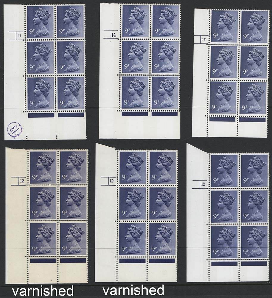 GB 1971 Machin unmounted mint PCP/PVAD cyl block range: 9p violet incl 9p cyl 12 varnish under phosphor, ditto over phosphor, see scan [ref 293-599/b92/ak0115]