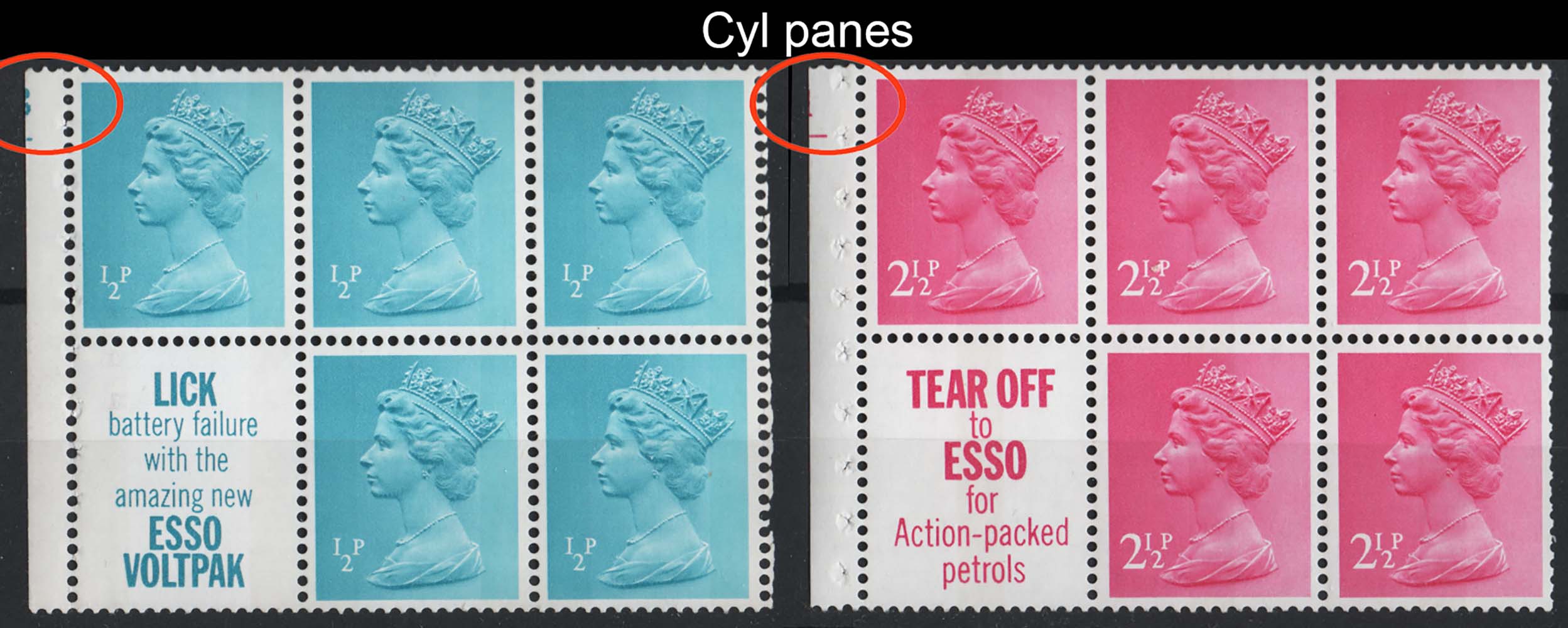 Machin ½p Lick and 2½p Tear Off cyl panes um, perfs as scan sgX841var, etc