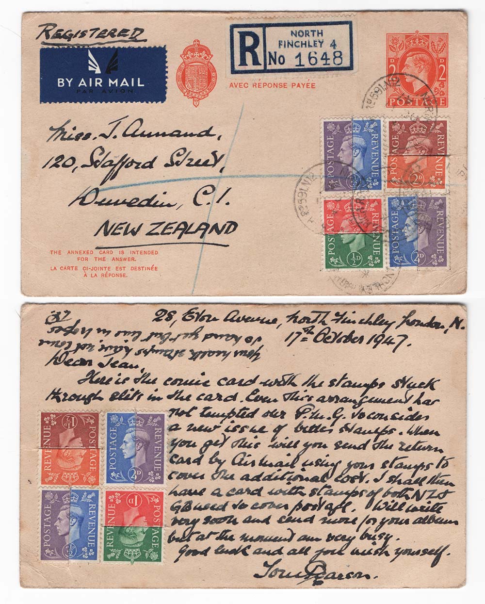 GB 1947 2d orange registered postal card to New Zealand uprated with 8 apparent ‘bisects’ actually complete stamps through slits in the card and adhered to both sides. Not surcharged as the complete postage is paid in full stamps – most unusual. [ref 291-611/sa/ai0252]