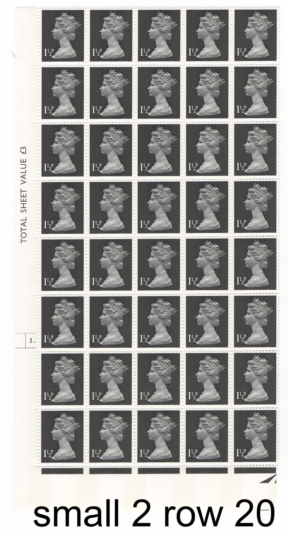 Machin 1½p OCP/PVA cyl 1 dot s2, small phosphor 2 by row 20 um cyl blk of 40 sgX848