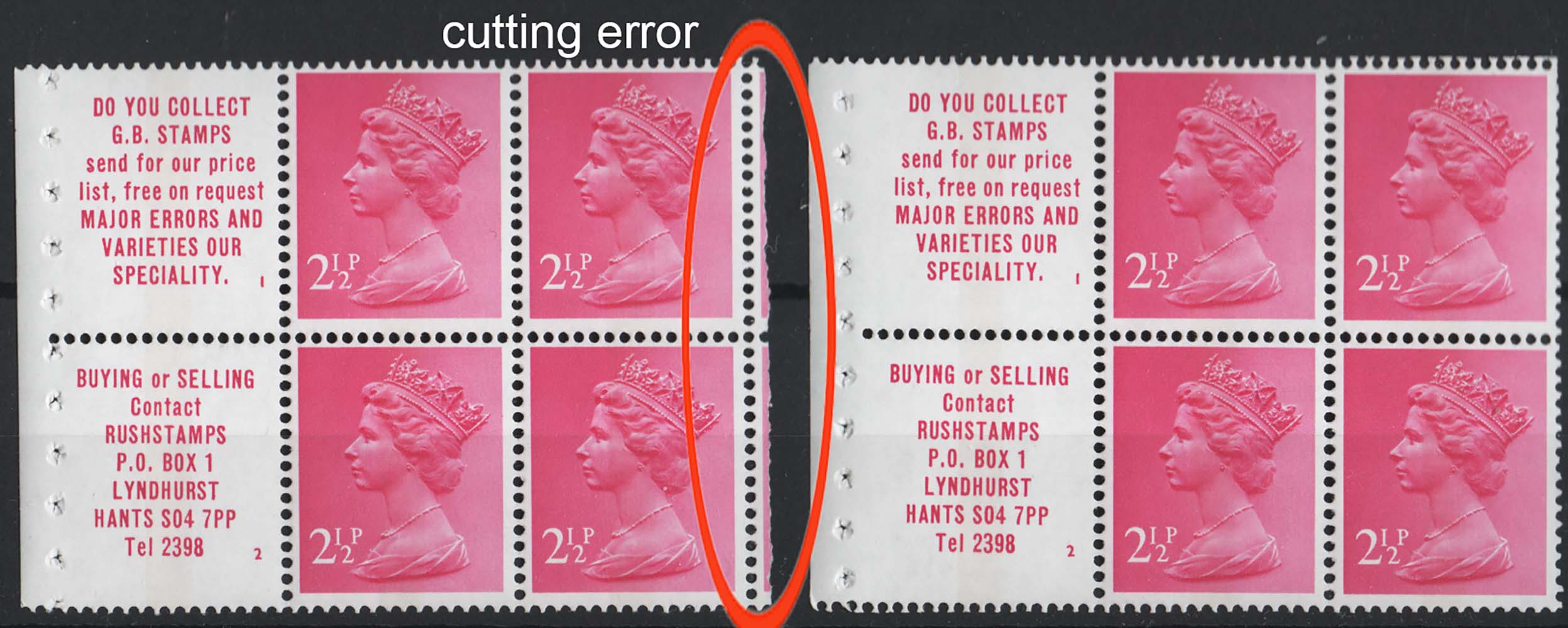 GB 1971 Machin 2½p pane of 4 + 2 labels unmounted mint cut wide at right showing slither of adjacent stamps in the primary sheet, good perfs + a normal pane sgX851 [ref 293-618/sa/ak0705]