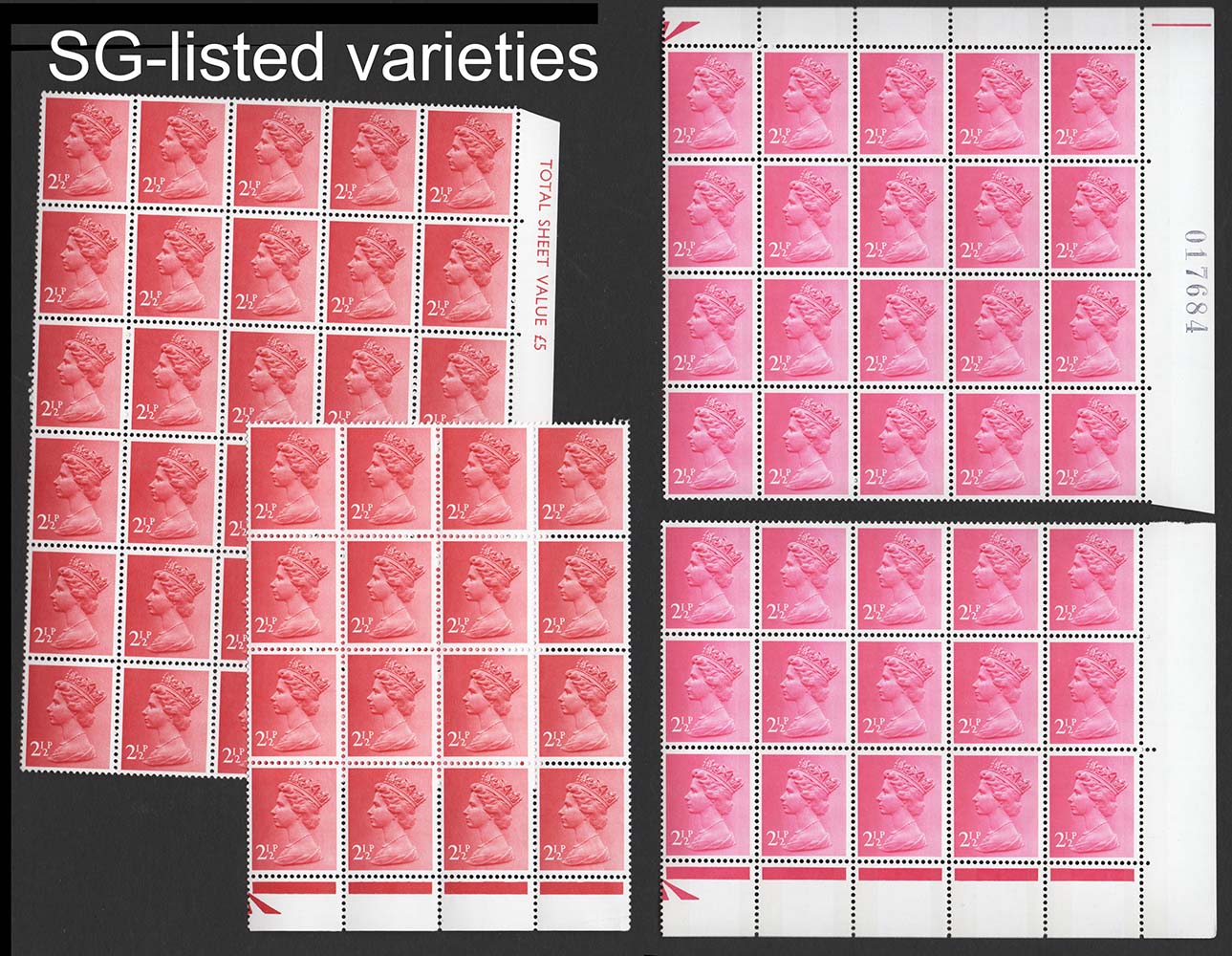Machin 2½p 2B PVAD sgX853 blks ex cyl 19 dot showing SG-listed varieties on r4/6, 19/7, 20/6, 20/7 also 2½p rose-red PCP r6/6, 17/8 um