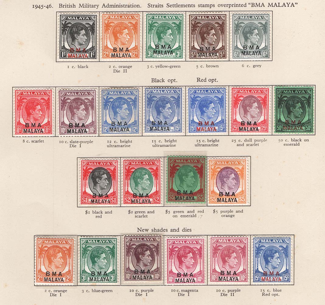 Malaya – BMA 1945 1c – $5 set of 15 very fine mint + several extras, 2c die 1, 15c red opvt,15c blue, etc sg1-18 cat £380+ [ref: 294/621 b08/am0173]