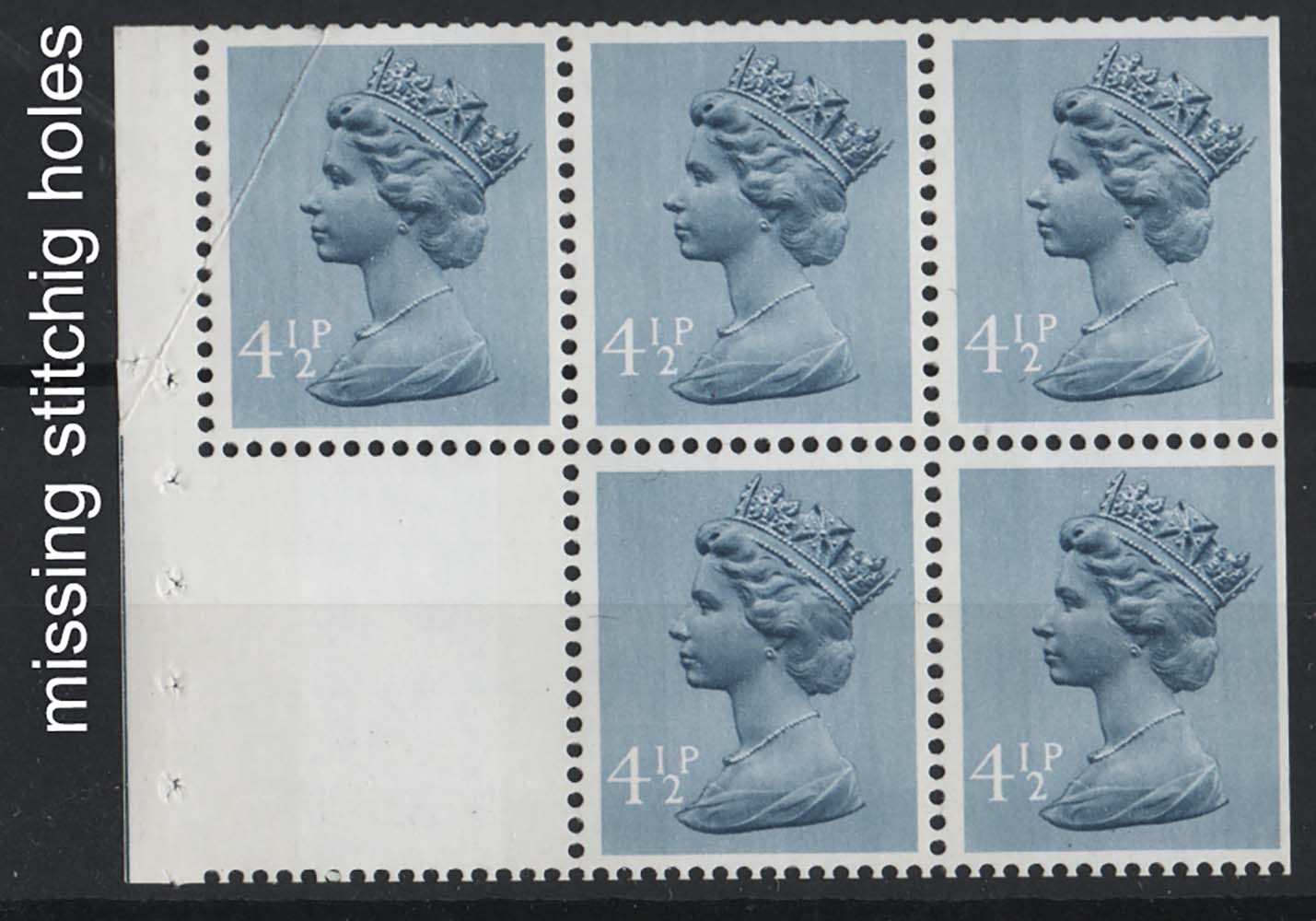 #624 GB 1971 Machin 4½p booklet pane stitching error, selvedge stitching holes